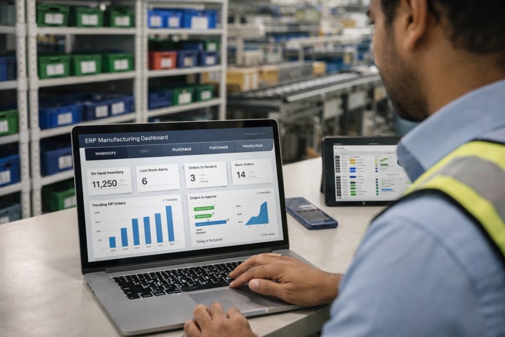 Ans. ERP systems provide real-time inventory tracking, automated MRP, accurate BOM management, and integrated procurement – helping reduce stockouts, excess inventory, and production downtime.